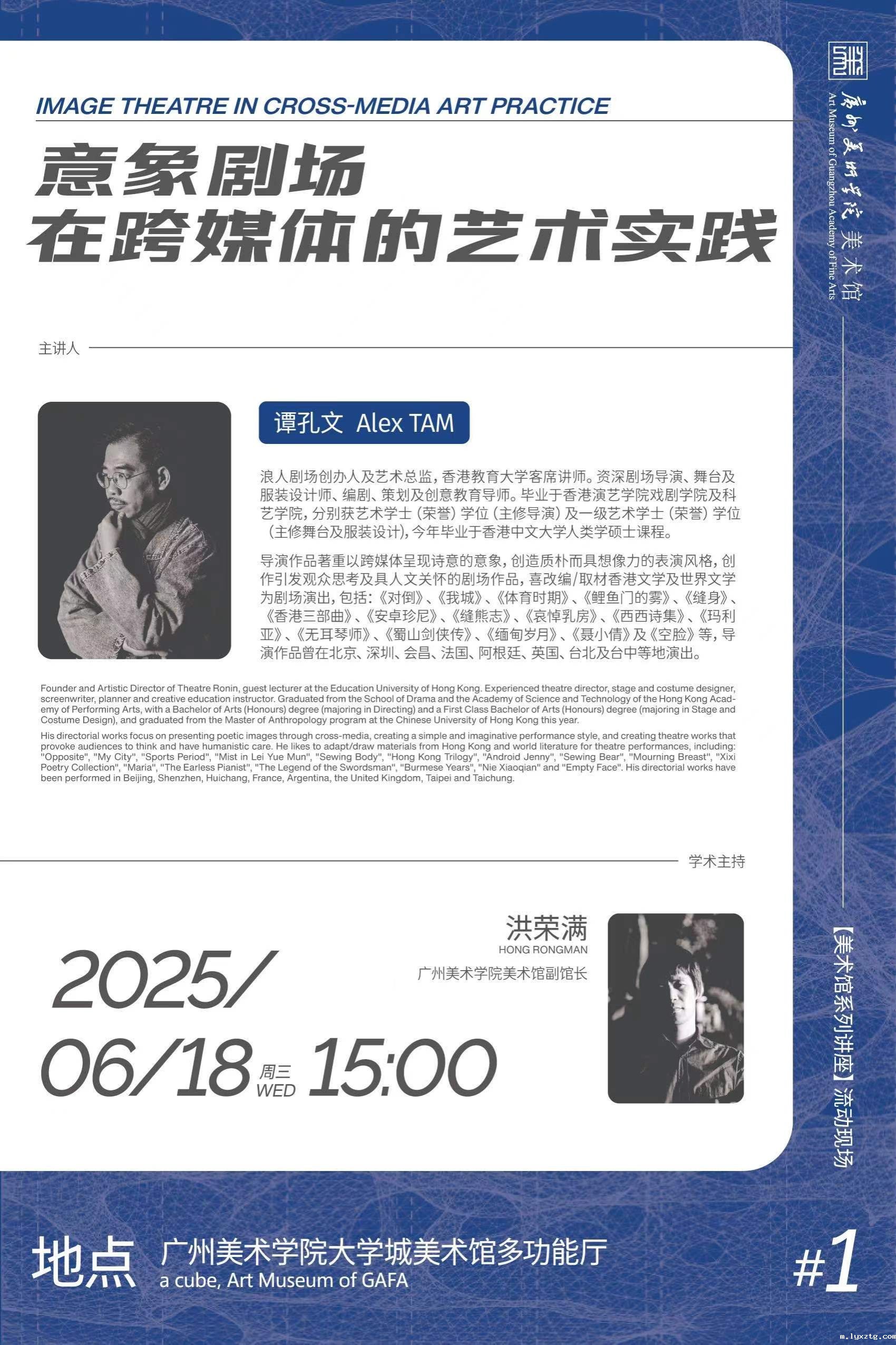 香港浪人剧场艺术总监谭孔文由90年代修读香港演艺学院期间,接触60年代成名的美国剧场导演Robert Wilson的意象剧场,会由此说起,拆解他自己过去20年的剧场演出,如何化身成「流动的视觉装置」一次又一次震撼观众,分享如何将空间构图、光影调度、符号隐喻、文字、声音及音乐,转化为创作者的凌厉意象。更与新媒体艺术家洪荣满对谈,了解中国21世纪跨媒体的艺术实践,那「意象剧场」的思考方式又如何可激发大家的创作?