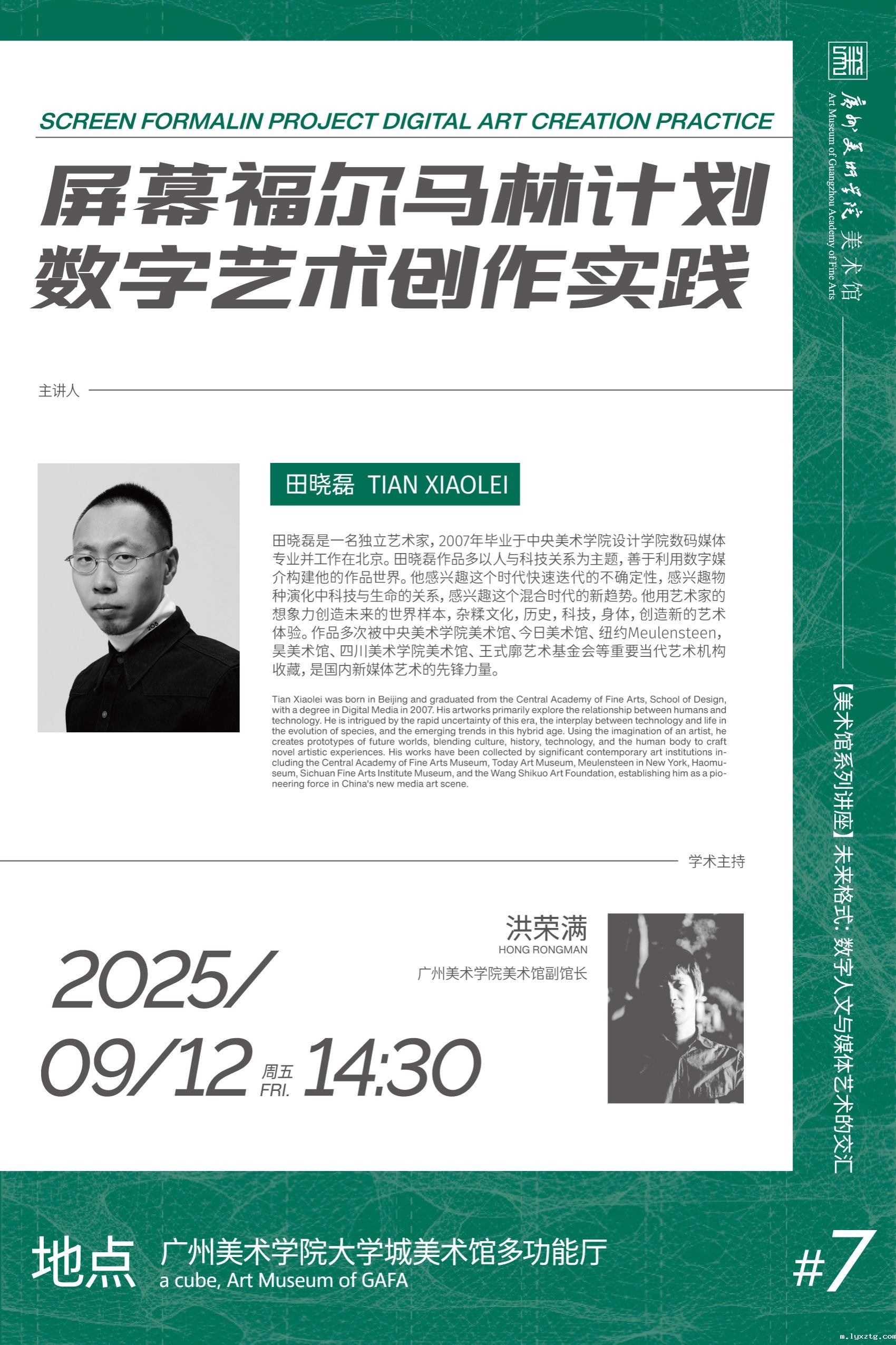 讲座简介:以艺术家本人的作品脉络为主线展开,介绍屏幕福尔马林计划的内容,并以创作时期为分类介绍过往作品,分享过往展览的经历及艺术跨界创作。